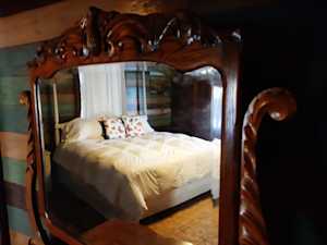 An artistic snap of the front King-sized bedroom through a mirror sitting atop of the refinished bedroom dresser