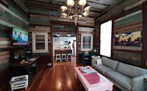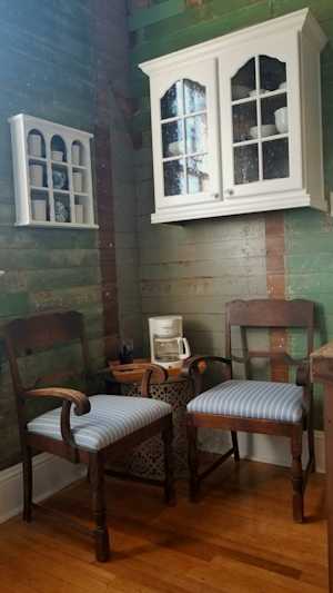 Small sitting area with the main living room with refinished chairs and cabinetry