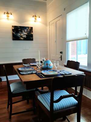 Cute dining room next to the open kitchen with natural light and access to the back outdoor balcony